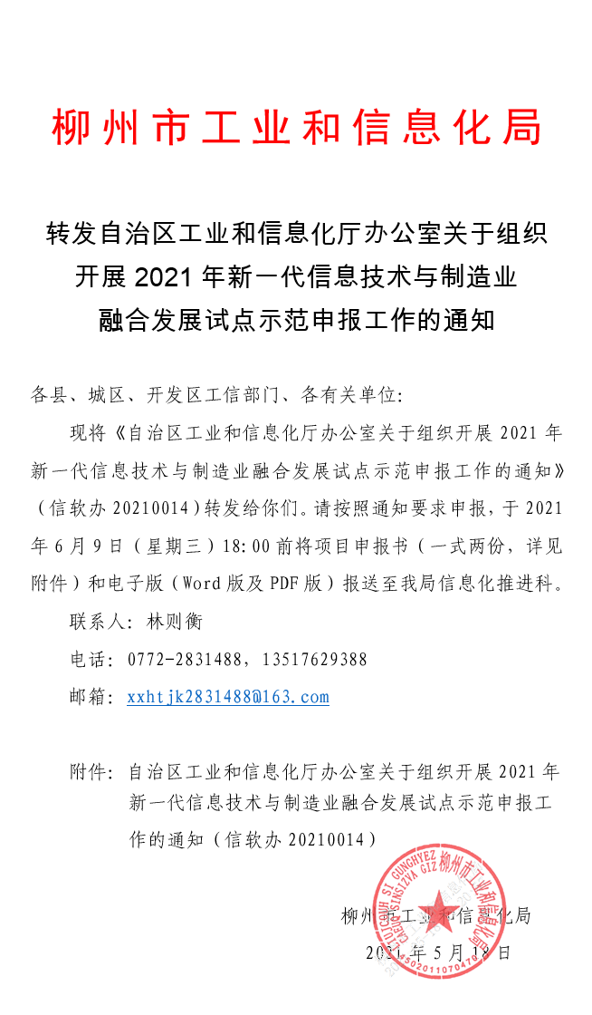 轉(zhuǎn)發(fā)自治區(qū)工業(yè)和信息化廳辦公室關(guān)于組織開展2021年新一代信息技術(shù)與制造業(yè)融合發(fā)展試點(diǎn)示范申報(bào)工作的通知(2021年5月18日)